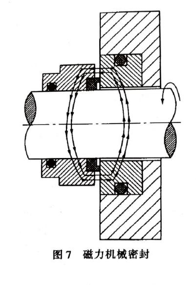 補償結構的作用是使密封端面緊密貼合,為達到此目的,選用的辦法有兩種,一是彈性力,二是磁力。只有在系統內壓力較低時采用磁力機械密封(圖7),大多數都用前者。除了用彈簧形成彈性力外還有用波紋管的,稱為波紋管式機械密封。波紋管的材質可用橡膠、聚四氟乙烯(圖8a)和焊接的金屬薄片等(圖8b)。
