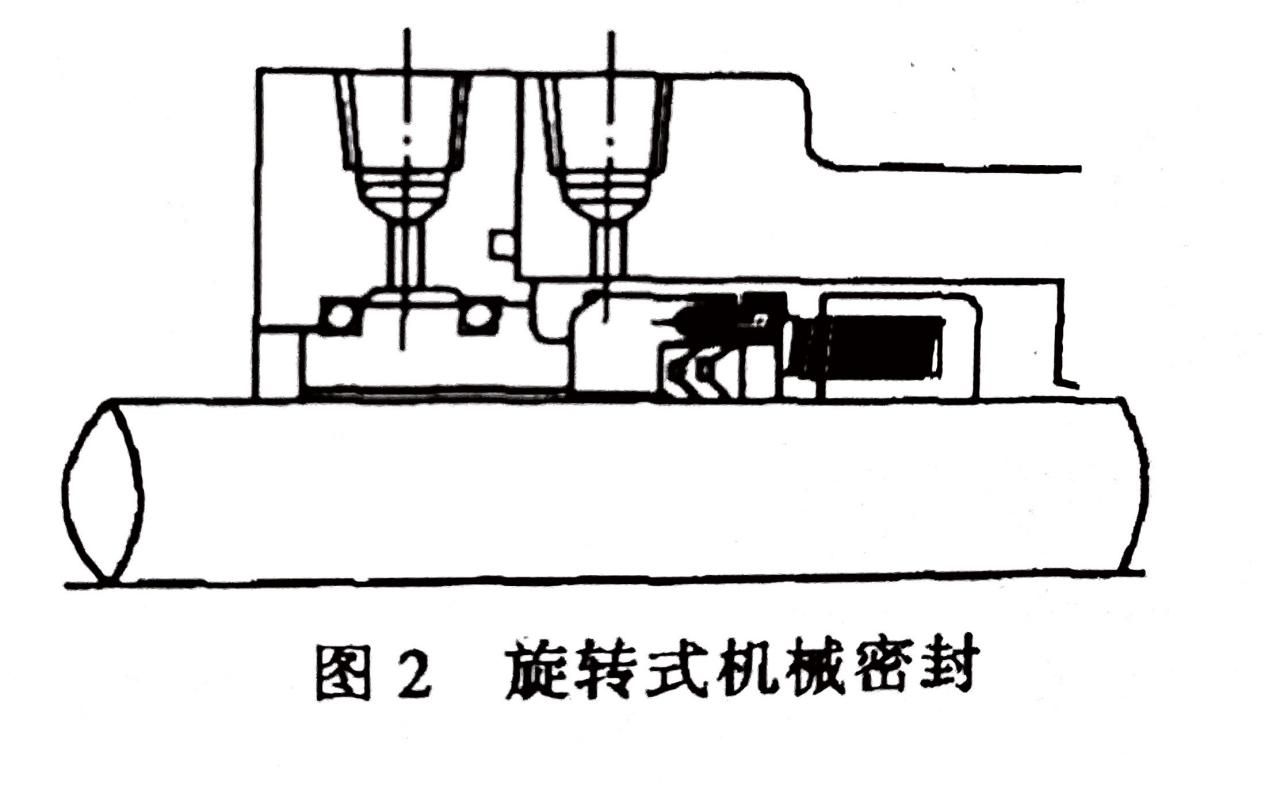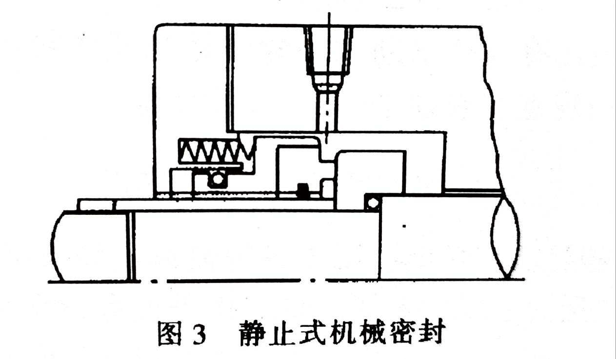 按補償結構彈性元件的運動情況,可以分為旋轉式和靜止式機械密封。補償結構隨軸旋轉的稱為旋轉式機械密封(圖2);補償結構不旋轉的(安裝在壓蓋內)稱為靜止式機械密封(圖3)。補償結構旋轉時易發生質量不平衡,同時消耗攪拌功率,因此,旋轉式密封不能用于高速;而靜止式密封可用于高速。可是旋轉式密封安裝較方便,所以,普通的機械密封大多選用旋轉式結構。