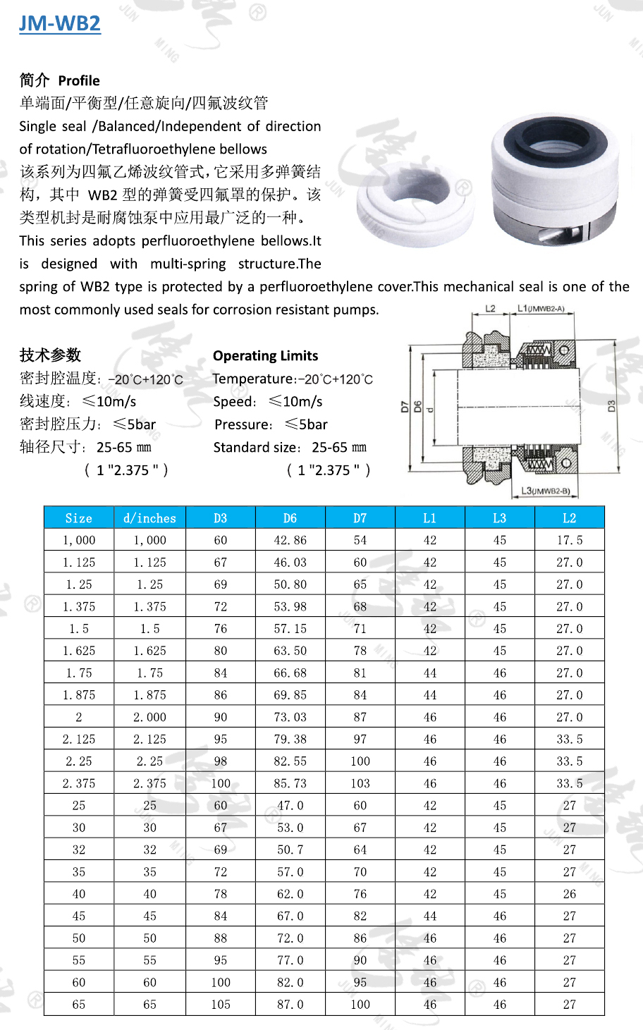 單端面/平衡型/任意旋向/四氟波紋管。 該系列為四氟乙烯波紋管式,它采用多彈簧結構,其中 WB2型的彈簧受四氟罩的保護。該類型機封是耐腐蝕泵中應用最廣泛的一種。