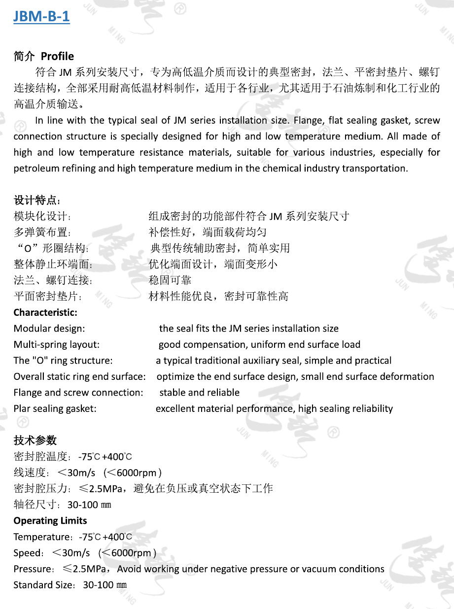 符合JM系列安裝尺寸,專為高低溫介質(zhì)而設(shè)計(jì)的典型密封,法蘭、平密封墊片、螺釘連接結(jié)構(gòu),全部采用耐高低溫材料制作,適用于各行業(yè),尤其適用于石油煉制和化工行業(yè)的高溫介質(zhì)輸送。