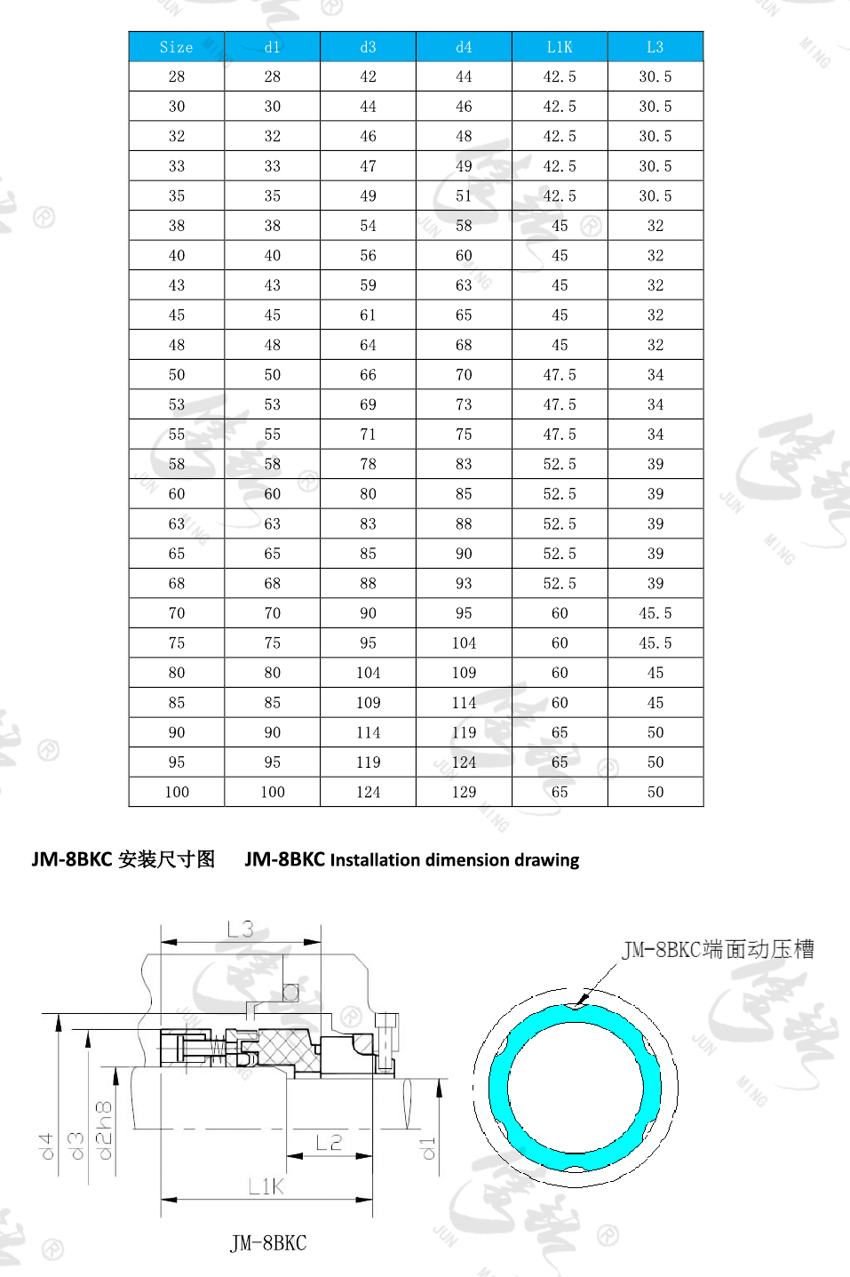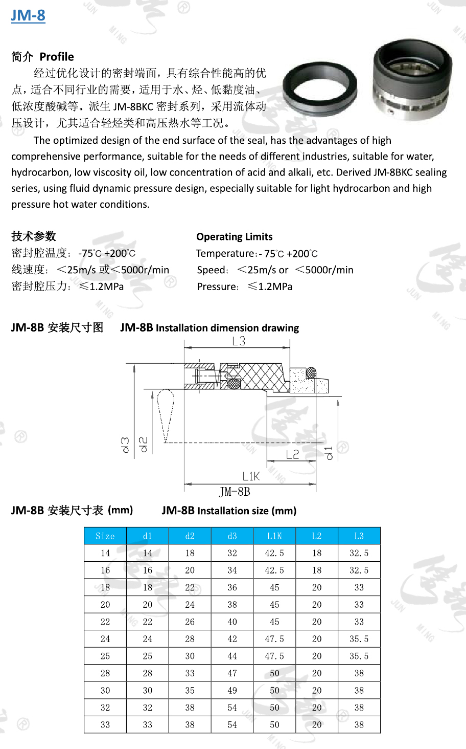 經過優化設計的密封端面,具有綜合性能高的優點,適合不同行業的需要,適用于水、烴、低黏度油、低濃度酸堿等。派生JM-8BKC密封系列,采用流體動壓設計,尤其適合輕烴類和高壓熱水等工況。