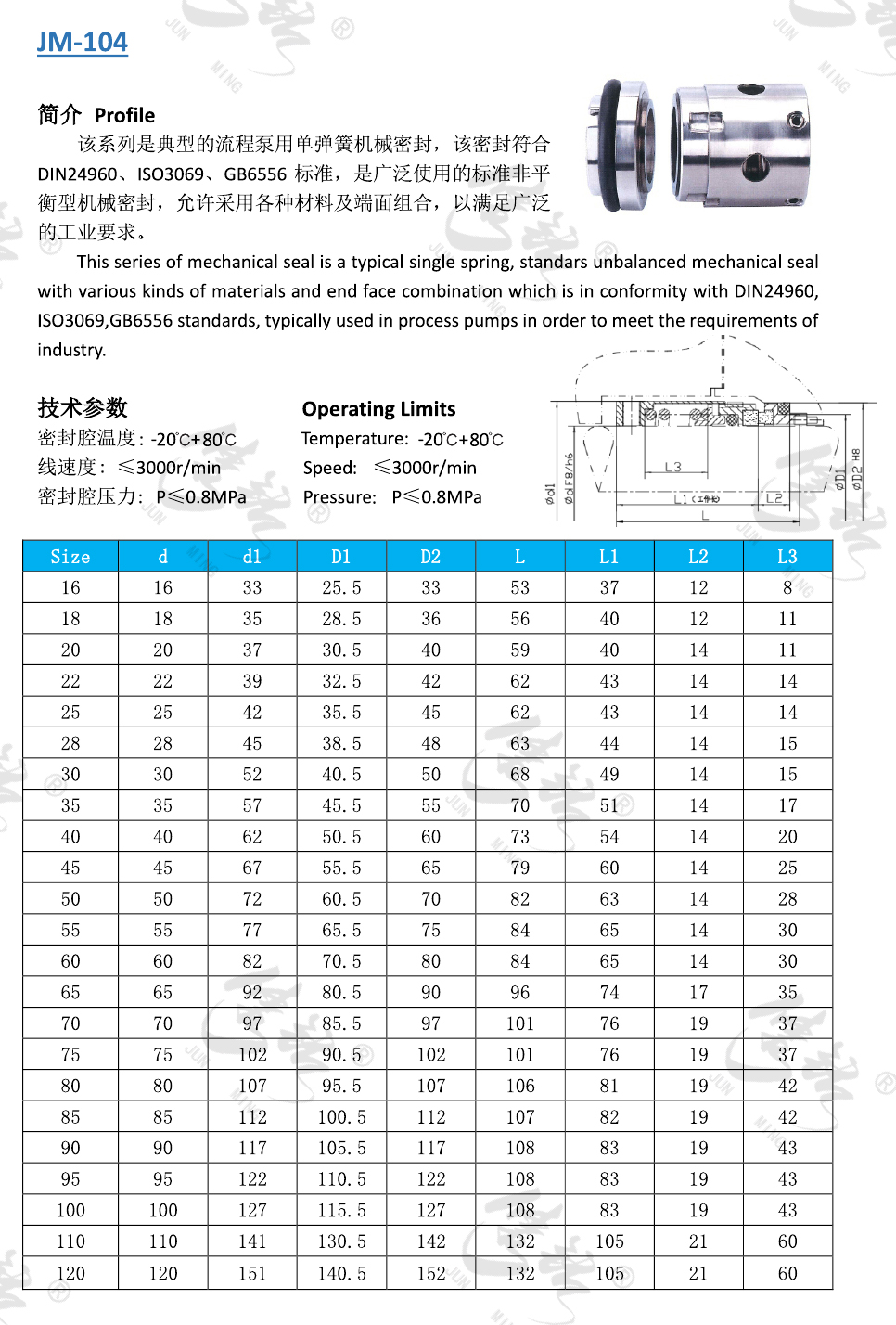 該系列是典型的流程泵用單彈簧機械密封,該密封符合 DIN24960、ISO3069、GB6556標準,是廣泛使用的標準非平衡型機械密封,允許采用各種材料及端面組合,以滿足廣泛的工業要求。