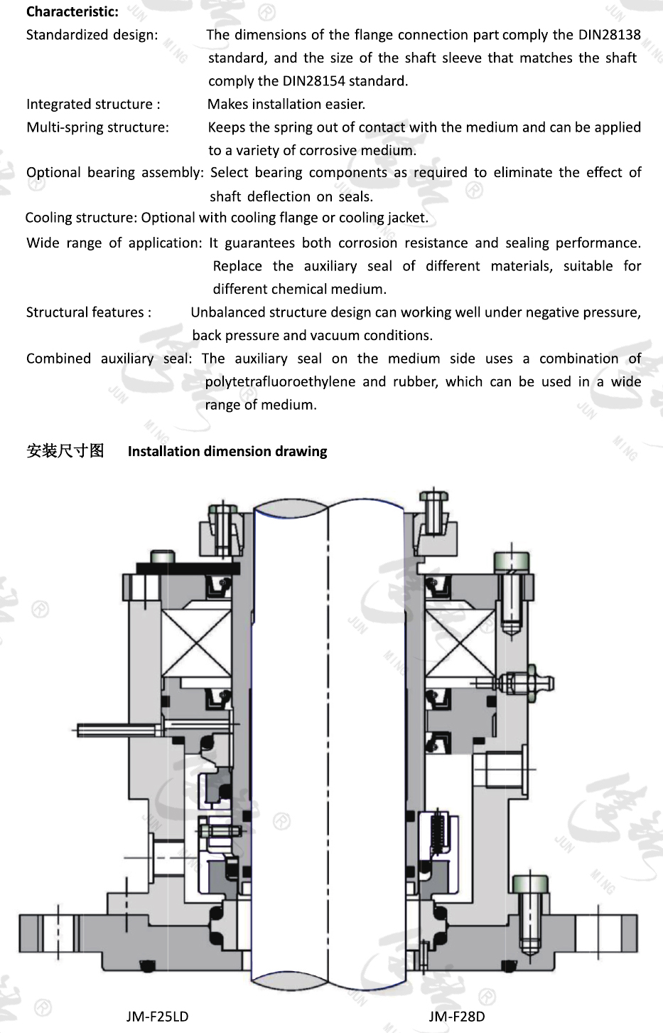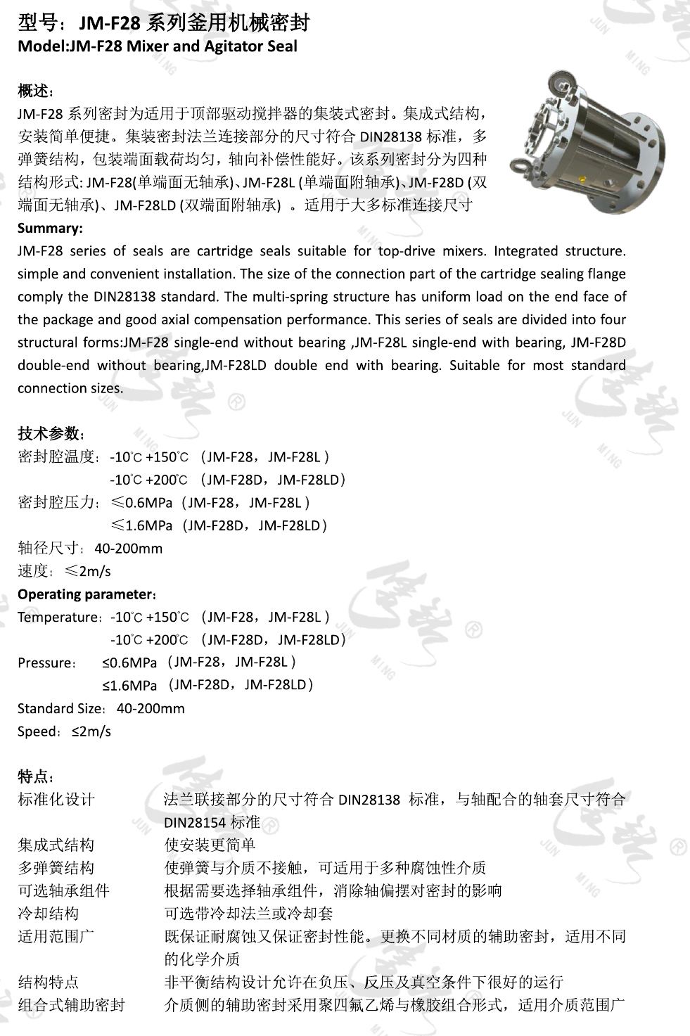 JM-F28系列密封為適用于頂部驅動攪拌器的集裝式密封。集成式結構,安裝簡單便捷。集裝密封法蘭連接部分的尺寸符合DIN28138標準,多彈簧結構,包裝端面載荷均勻,軸向補償性能好。該系列密封分為四種結構形式: JM-F28(單端面無軸承)、JM-F28L (單端面附軸承)、JM-F28D (雙端面無軸承)、JM-F28LD (雙端面附軸承) 。適用于大多標準連接尺寸