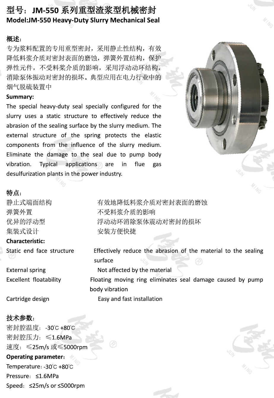 專為漿料配置的專用重型密封,采用靜止性結構,有效降低料漿介質(zhì)對密封表面的磨蝕,彈簧外置結構,保護彈性元件,不受料槳介質(zhì)的影響,采用浮動動環(huán)結構,消除泵體振動對密封的損壞。典型應用在電力行業(yè)中的煙氣脫硫裝置中