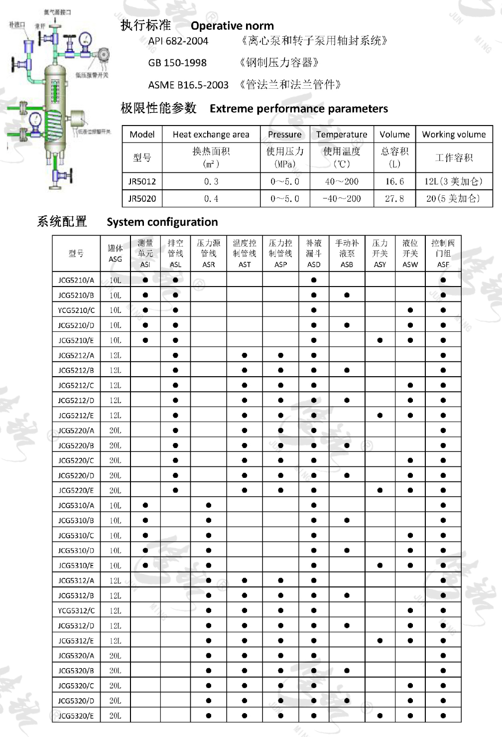 JM-R系列機械密封輔助系統(儲液罐系統)適用于串聯密封及雙端面密封。作為緩沖液或隔離液的存儲容器,主要由儲液罐、測量單元、檢測控制部件、管路及控制閥等部件構成,保證密封正常使用。 該系列密封輔助系統提供方便的目視觀測窗口、液位報警開關接口及壓力報警開關接口。 該系列符合API682方案52(無壓)或53A(有壓)系統。當機械密封軸徑小于等于60mm時,可選用JR5012系列;當機械密封軸徑大于等于60mm時,可選用JR5020系列。