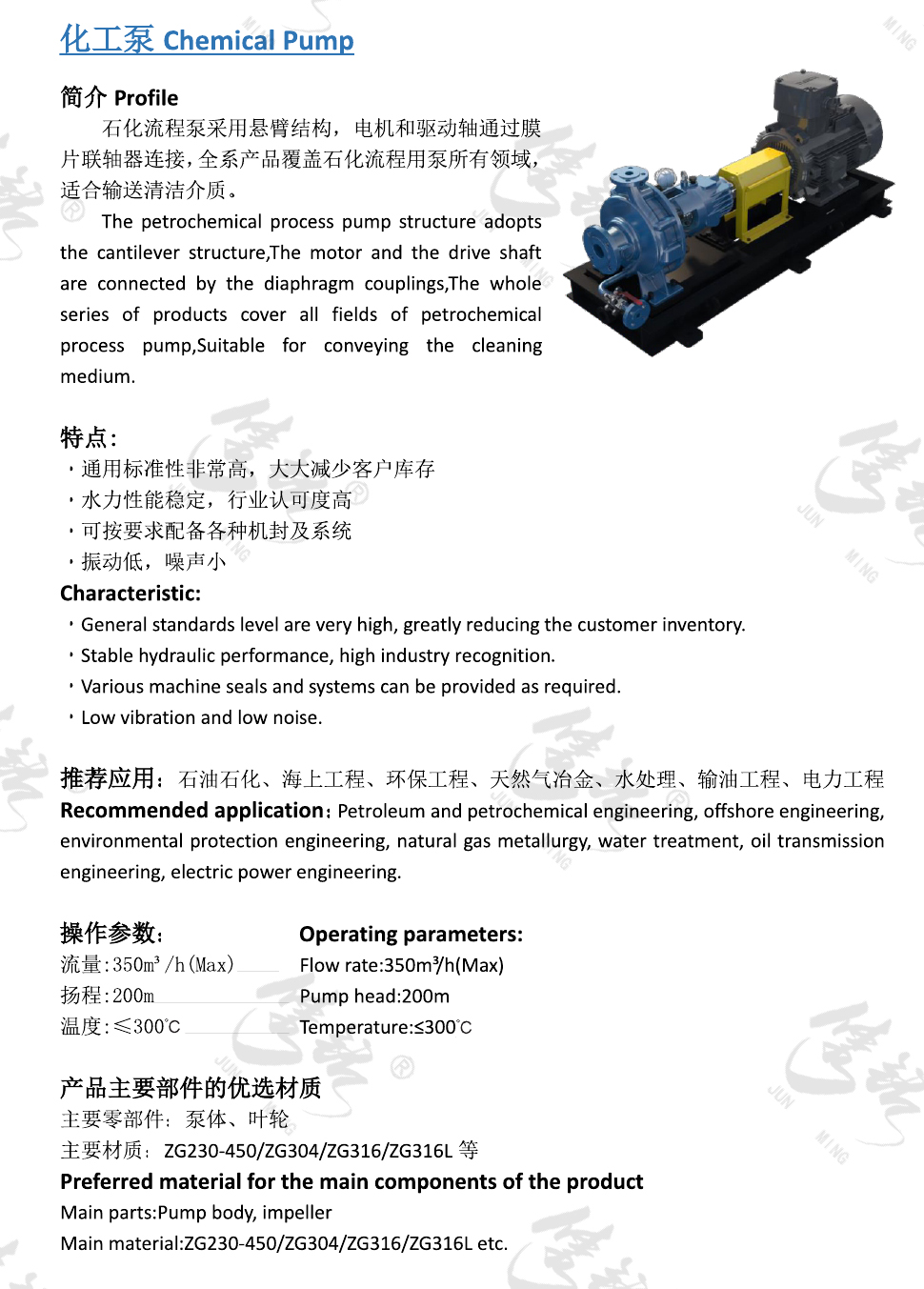 石化流程泵采用懸臂結構,電機和驅動軸通過膜片聯軸器連接,全系產品覆蓋石化流程用泵所有領域,適合輸送清潔介質。